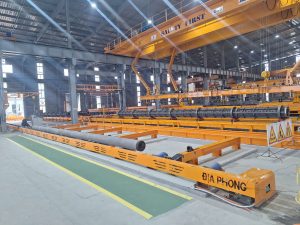 Con lăn chuyển cọc là thiết bị trung chuyển cọc bê tông từ trong xưởng sản xuất ra bãi chứa thành phẩm.